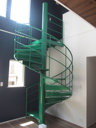 らせん階段は、デザイン性の高さが好まれ、戸建て住宅に設置されることがあります。手すりが柵状のらせん階段部分を吹き抜けにすれば、高窓などからの光を一階部分へ採り込み明るく開放的な空間が得られます。省スペースで設置可能ならせん階段は、特に狭小住宅などでの設置例が多くあります。