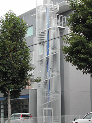 この様なデザイン性・省スペース性をもつらせん階段は屋外階段の用途もあり、おしゃれな外観を求めるマンションや施設の非常用階段として設置されています。