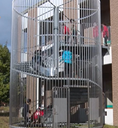 山陽建工株式会社の避難用すべり台「スカイダー」は、常時固定式。
