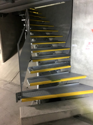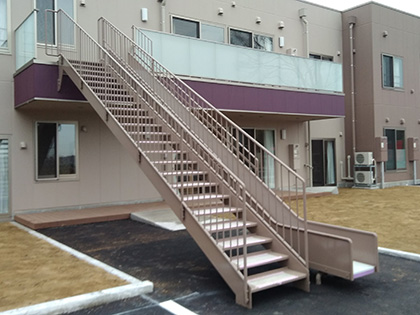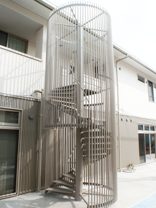 この様なデザイン性・省スペース性をもつらせん階段は屋外階段の用途もあり、おしゃれな外観を求めるマンションや施設の非常用階段として設置されています。