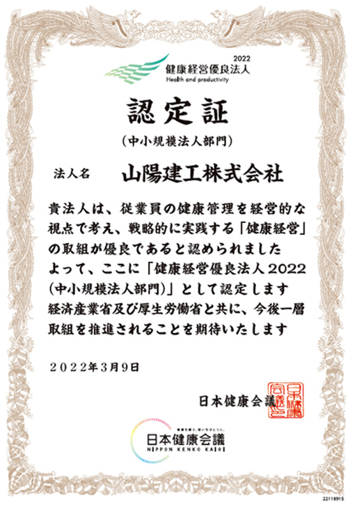 山陽建工株式会社は、健康経営の推進を宣言します。わが社の経営理念「真心をもって社員一人ひとりの幸福を追求する」 を実践するためには、社員とその家族が心身ともに健康であることが 第一と考え、ここに健康経営の推進を宣言します。
